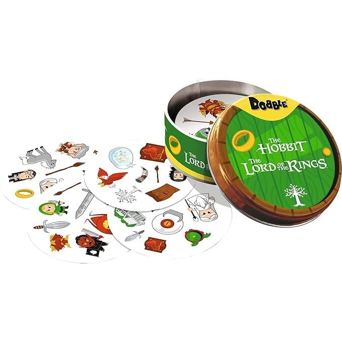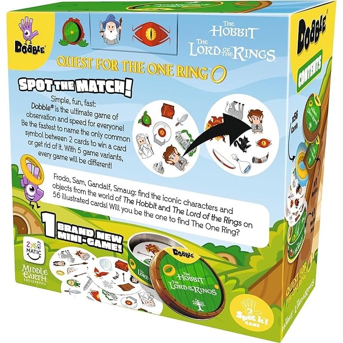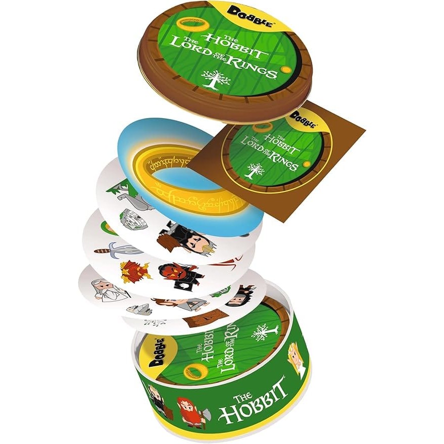 Dobble: Quest for the One Ring is a fast-paced observation card game that brings The Hobbit and The Lord of the Rings to your table. Fans of Tolkien and casual players alike race to name the one shared symbol between two cards, testing speed and focus in quick, engaging rounds.