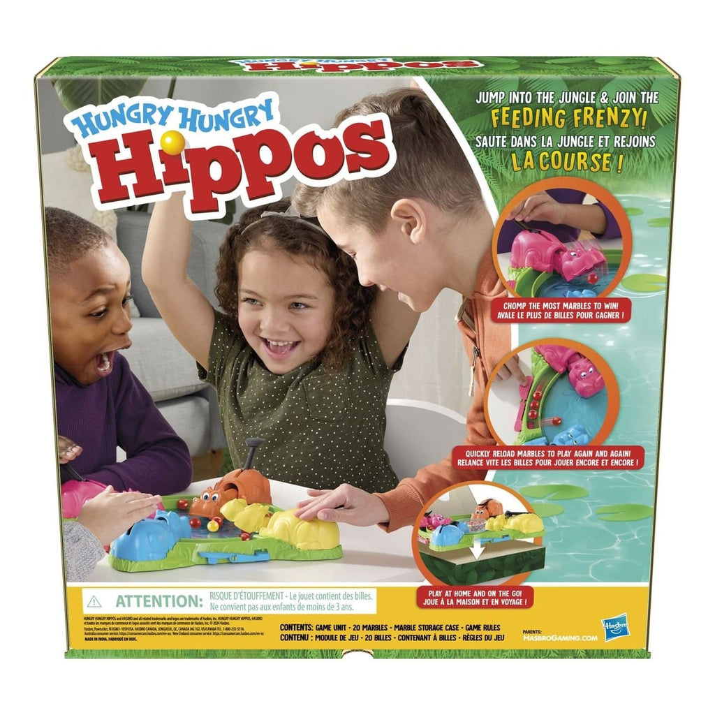Hungry Hungry Hippos invites your family to the jungle for a wild feeding frenzy. This timeless kids board game turns playtime into fast-paced chaos as players race to make their hippo chomp the most marbles and win the game.