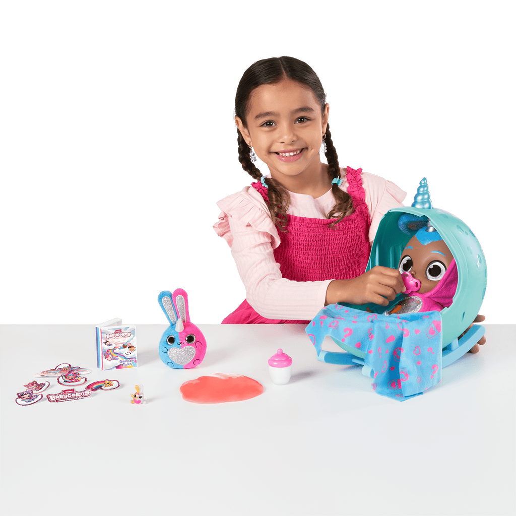 The Babycorns have arrived and can't wait to play! Unbox the magical Rainbocorn babies, nestled inside their magical cribs. With over 30 surprises waiting to be discovered, this unboxing adventure brings smiles, giggles, and magical moments right when you open the box.