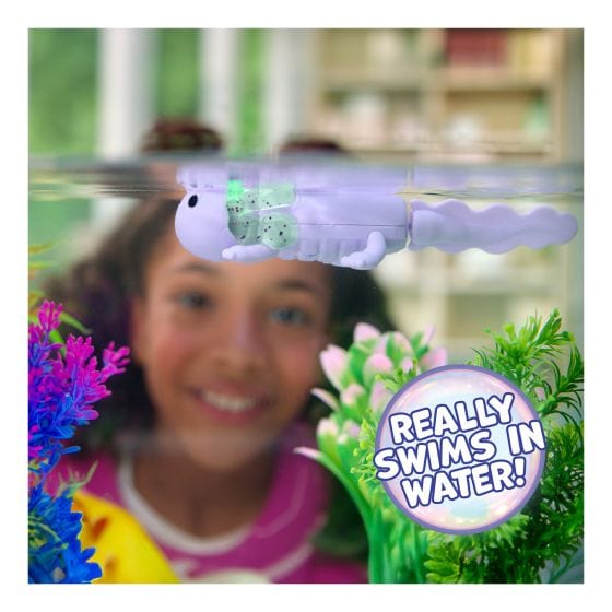 Watch your baby axolotl swim in a bowl, an aquarium, or a pool (not included). Just dip him in water and enjoy the underwater fun. Remember to avoid salty or dirty water for the best performance.