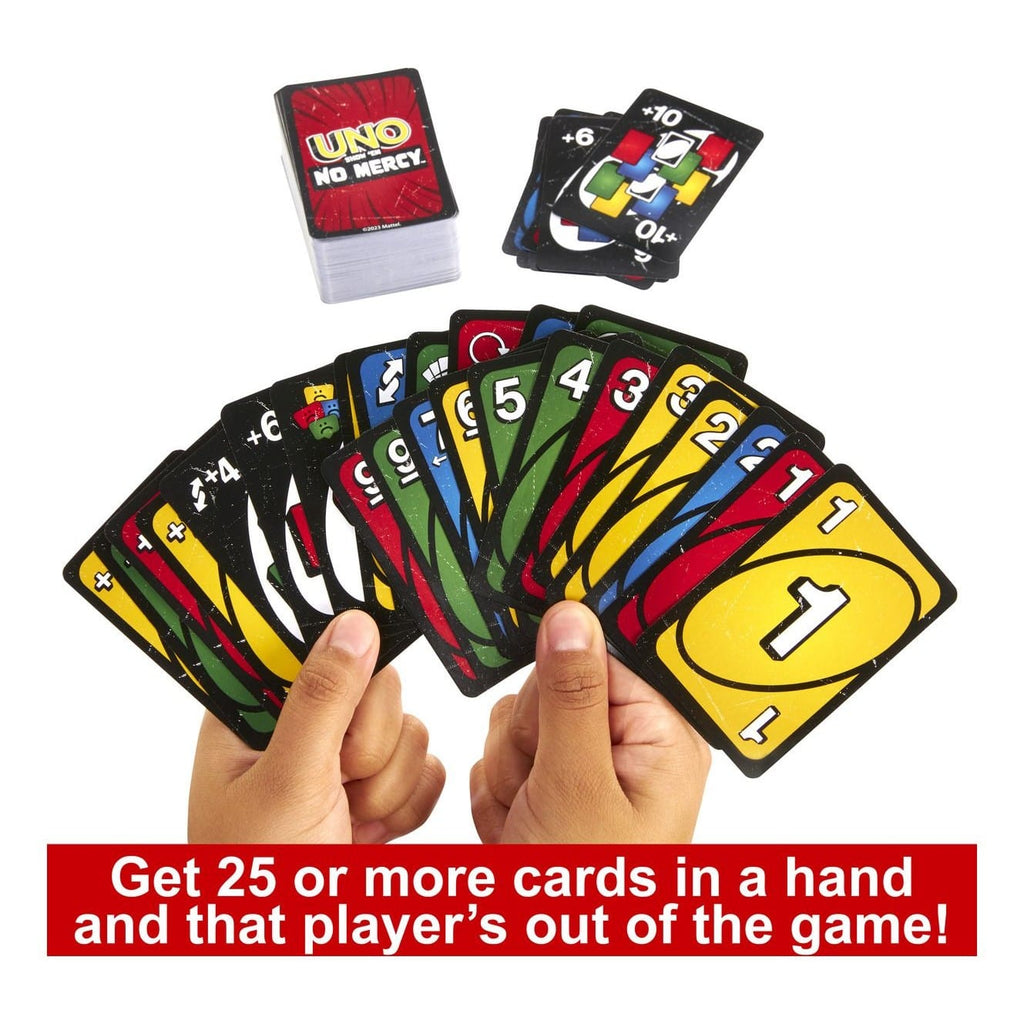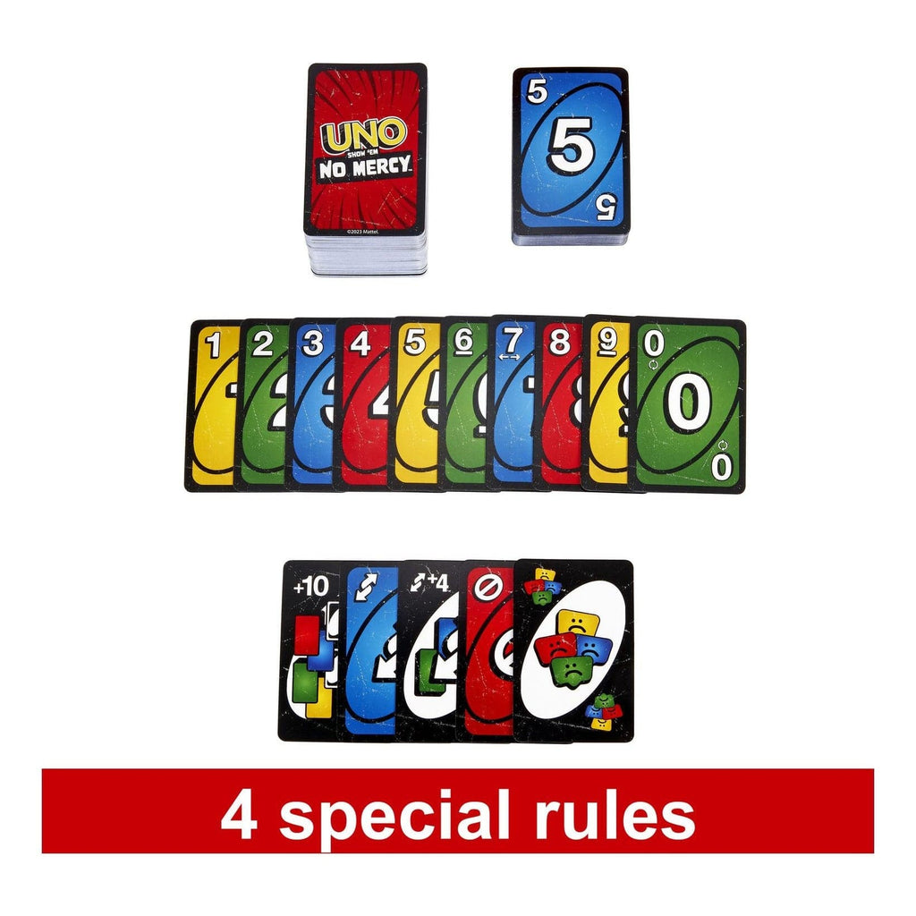 Get ready for a wild and ruthless twist on a classic favorite with the UNO Show 'Em No Mercy Card Game from Mattel! This exciting update to the beloved UNO game brings in thrilling new twists that are sure to spice up family game night or any gathering with friends. Featuring innovative cards like Wild Draw 6, Wild Draw 10, Skip Everyone, and the unpredictable Wild Color Roulette, this game transforms the traditional UNO experience into an all-out battle for supremacy!