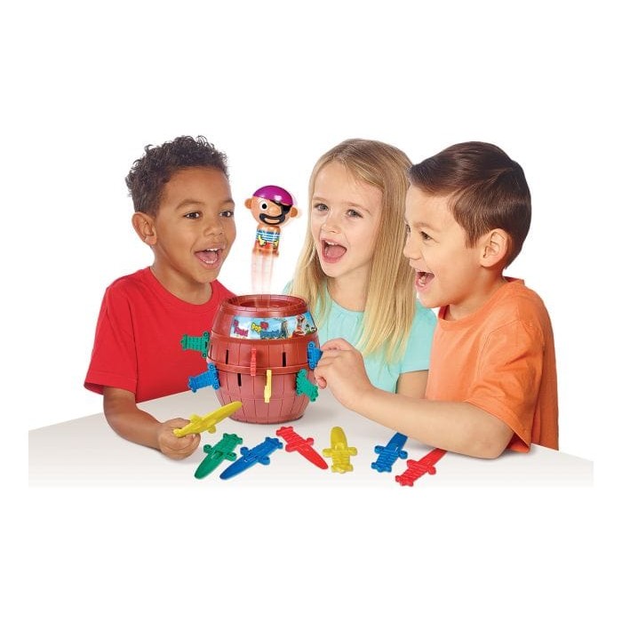Pop Up Pirate is the classic children's action game that turns any table into a stage for suspense and giggles. Take turns sliding swords into the barrel, but one wrong move will send Black Beard flying. Whose sword will be the first to pop him out of his barrel? Play head-to-head or with up to four players for fast-paced, family-friendly fun.